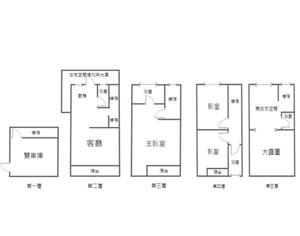 一樓可停雙車 二樓客餐聽 三樓整層主臥 四樓2間臥室 五樓開放式格局及大露臺