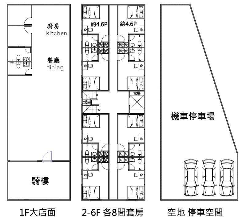 ◎2-6樓每層8戶套房, 1樓店面